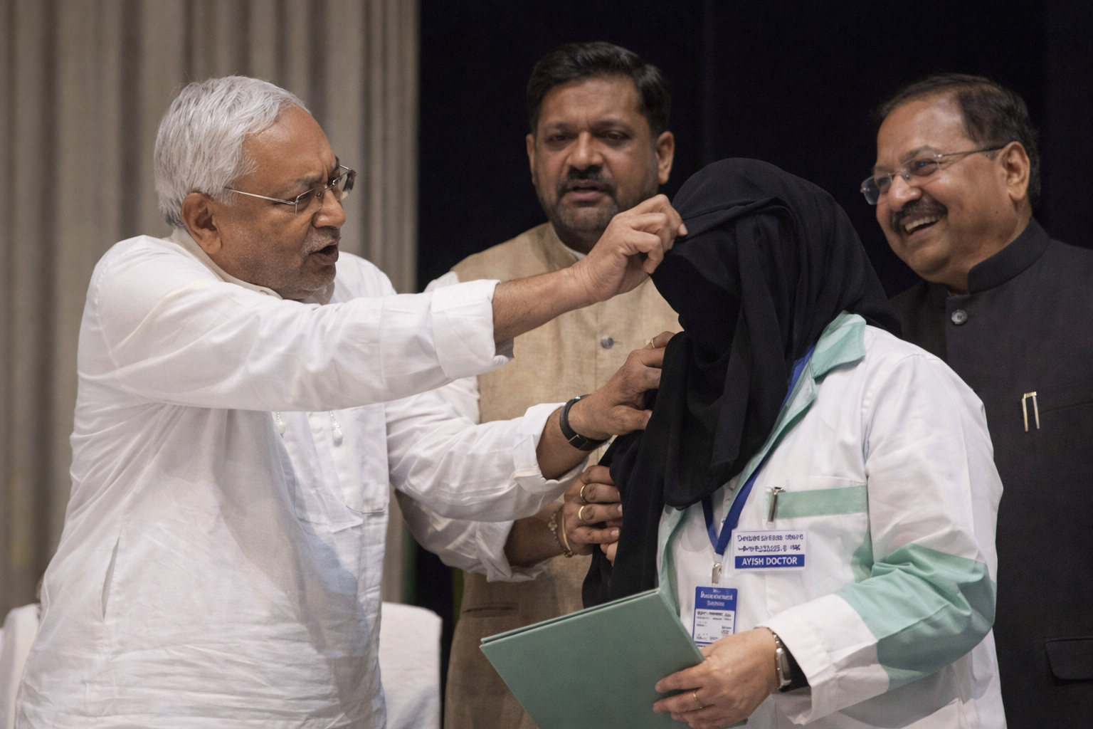 सोशल मीडिया पर वायरल क्लिप में देखा जा सकता है कि नियुक्ति पत्र लेने के लिए मंच पर आई एक मुस्लिम महिला डॉक्टर हिजाब में हैं। इसी दौरान मुख्यमंत्री नीतीश कुमार उनसे पूछते हैं, “ये क्या है?” और फिर थोड़ा झुककर उनके चेहरे से हिजाब नीचे की ओर खींच देते हैं।